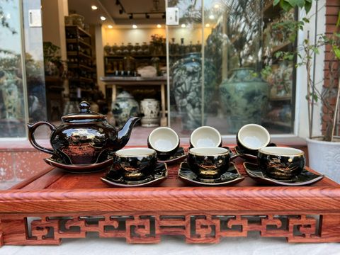Bộ Ấm Chén Bát Tràng Men Hỏa Biến Vẽ Vàng Vinh Hoa Phú Quý BKCEVN-8086