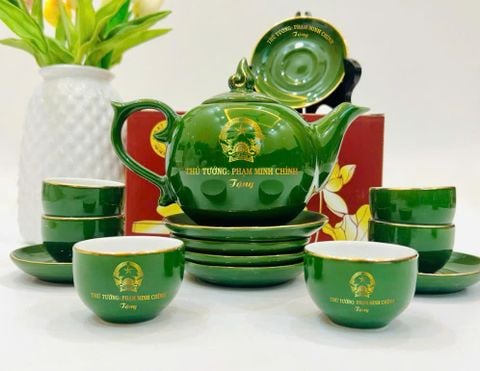 Bộ ấm chén men xanh in logo Quốc Huy và hình ảnh Thủ tướng Chính phủ là món quà cao cấp đầy ý nghĩa, được thiết kế riêng cho các dịp lễ tân, hội nghị, sự kiện ngoại giao hoặc tặng đối tượng có vị trí quan trọng trong xã hội. Sản phẩm không chỉ nổi bật bởi chất liệu gốm sứ Bát Tràng cao cấp, mà còn mang đậm giá trị tinh thần, thể hiện sự trân trọng, trang nghiêm và đậm đà bản sắc dân tộc.
