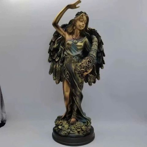 Điểm đặc biệt là đôi cánh lớn phía sau được chạm khắc tỉ mỉ, tạo nên thế vững chãi, bay bổng – thể hiện sự bảo hộ, che chở và sức mạnh nhẹ nhàng của cái đẹp. Lớp phủ đồng giả cổ không chỉ làm tăng tính mỹ thuật mà còn góp phần tạo chiều sâu, khiến ánh sáng phản chiếu nhẹ nhàng trên từng góc cạnh, khiến tượng như thực sự "sống" giữa không gian bài trí.
